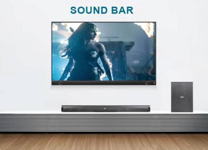 A soundbar, sound bar or media bar is a type of loudspeaker that projects audio from a wide enclosure. It is much wider than it is tall, partly for acoustic reasons, and partly so it can be mounted above or below a display device. In a soundbar, multiple speakers are placed in a single cabinet, which helps to create stereo sound or a surround-sound effect. A separate subwoofer is typically included with, or may be used to supplement, a soundbar.